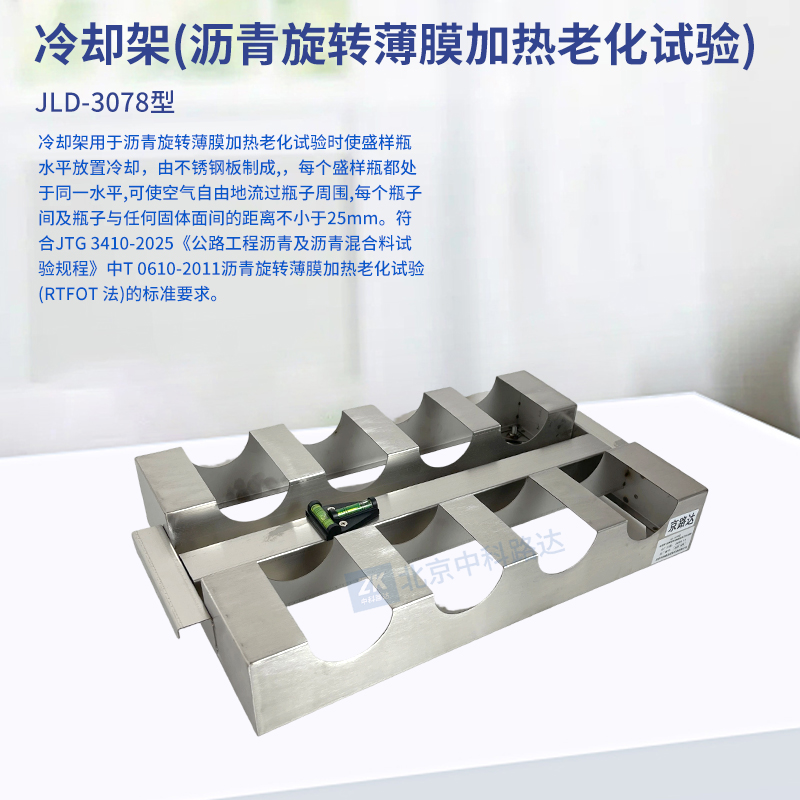 冷却架用于沥青旋转薄膜加热老化试验时使盛样瓶水平放置冷却,由不锈钢板制成,,每个盛样瓶都处于同一水平,可使空气自由地流过瓶子周围,每个瓶子间及瓶子与任何固体面间的距离不小于25mm。符合JTG 3410-2025《公路工程沥青及沥青混合料试验规程》中T 0610-2011沥青旋转薄膜加热老化试验(RTFOT 法)的标准要求。