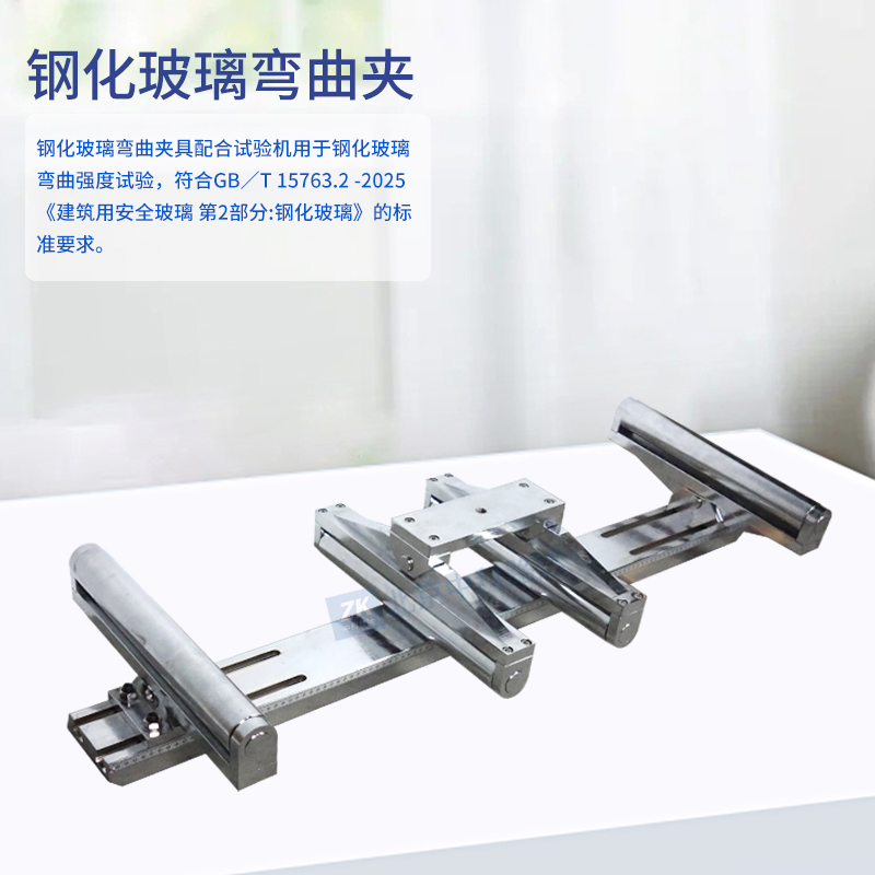钢化玻璃弯曲夹具配合试验机用于钢化玻璃弯曲强度试验,符合GB∕T 15763.2 -2025《建筑用安全玻璃 第2部分:钢化玻璃》的标准要求。